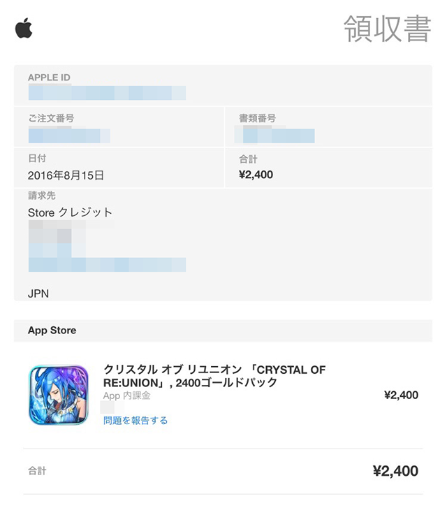 パックを購入すると、お客様のApple IDに設定しているメールアドレス宛てにiTunesStoreから購入情報(領収書)のメールが送られてきます。