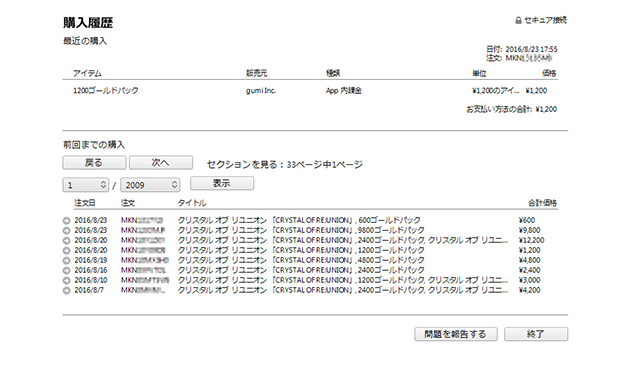 ※スクリーンショットを撮影される際には「受領番号、注文番号、受取日、注文合計(購入金額)、アイテム(購入したアイテム名)」が写るように撮影をお願いします。