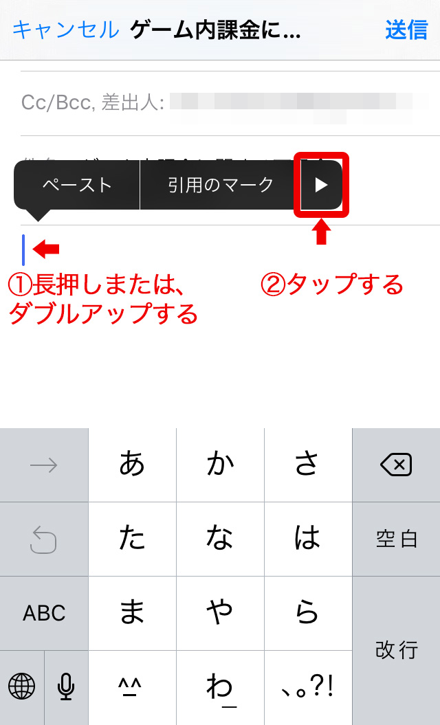 1.本文内を長押しまたはダブルタップしてメニューを表示させます。