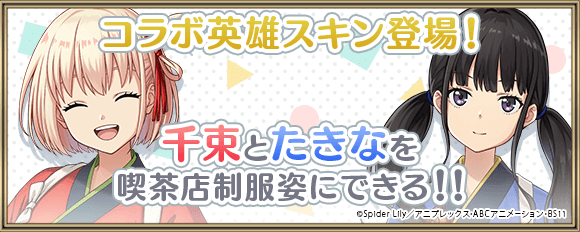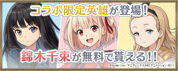 コラボ限定の新英雄として、「錦木千束」、「井ノ上たきな」、「クルミ」が登場。