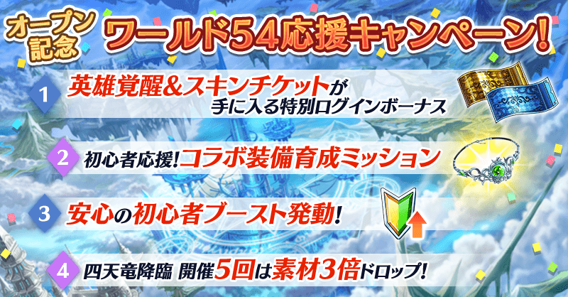 W54限定で、四天竜降臨イベントにおいて初開催から5回までは素材ドロップ数が3倍になります!
