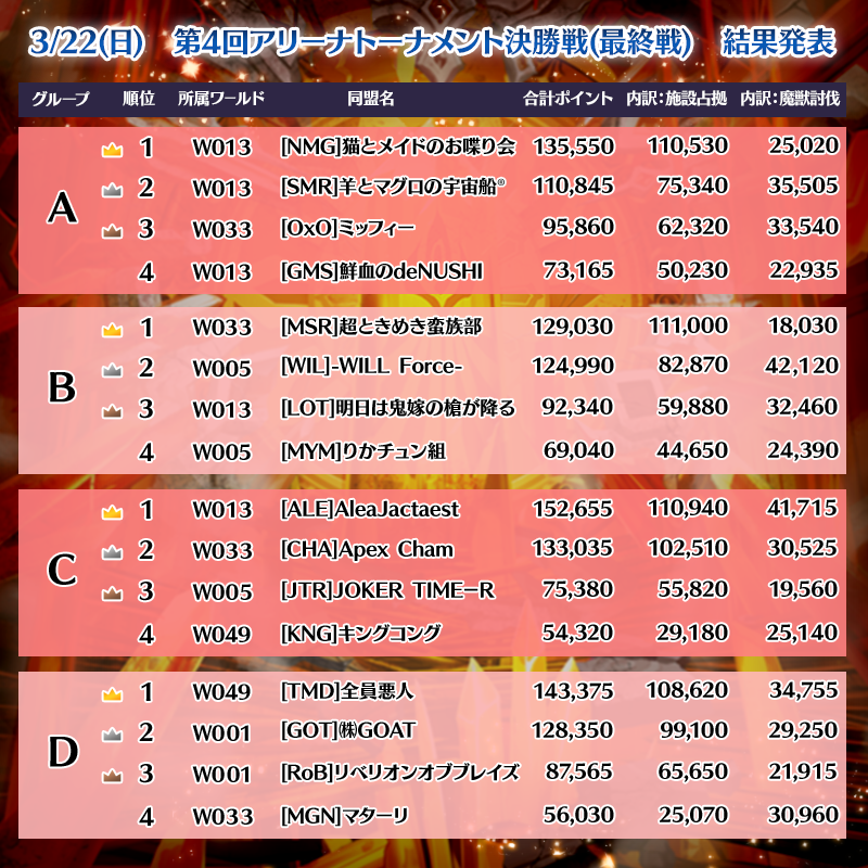 グループA:本戦で各グループの1位同盟(4同盟)