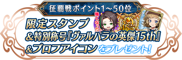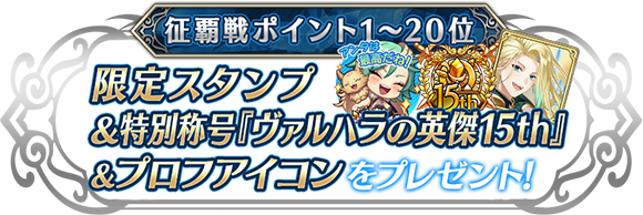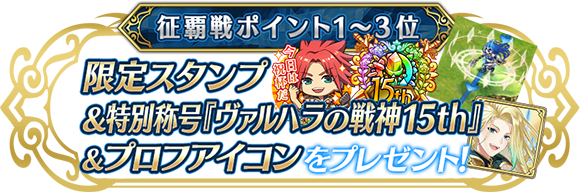 | 征覇戦の報酬、「覇王プロフアイコン」、「称号ヴァルハラの覇王」が貰えるプレーヤーは、どの段階で決定されますか? | 報酬は、「1時間塔を占拠して制覇」した場合、その瞬間の同盟盟主へ配布されます。それ以外の場合は、「終了時占拠ボーナス」が決まったイベント満了時点で、一番ポイントの高かった制覇同盟の盟主へ配布されます。 |